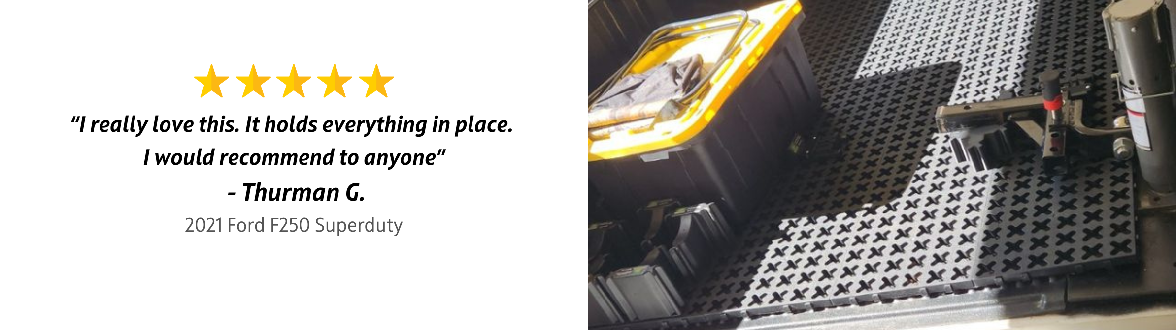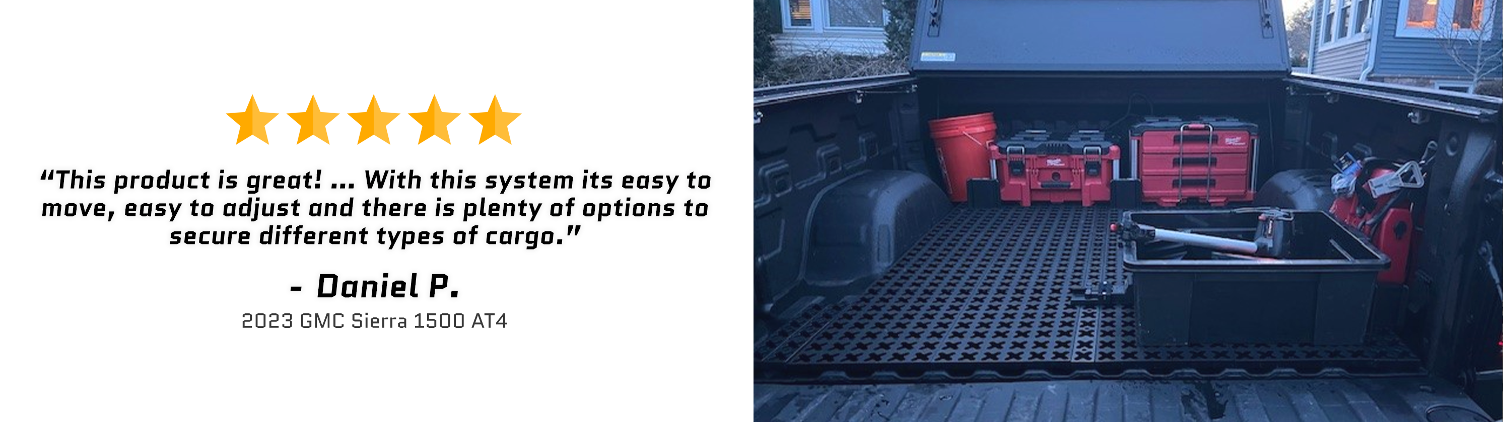 Organize your Rivian R1T’s bed with a cargo management system designed for modern truck bed organization. Adjustable blockers fit into the mat in any arrangement, creating compartments for tools, gear, and equipment. The system fits between the wheel wells and slides toward the tailgate for quick access. Works with drawer systems, bed slides, and other custom setups.