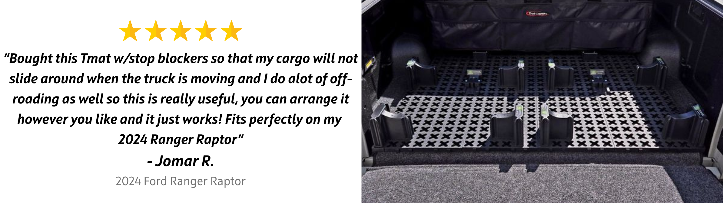WARNING: Tmat is designed for enclosed and covered cargo areas such as covered truck beds, SUVs, vans, campers, and enclosed trailers. Extra precautions must be taken when used in an open-air cargo area to protect from wind and roll-overs. Tmat should never be used in an open-sided bed or with the tailgate down.