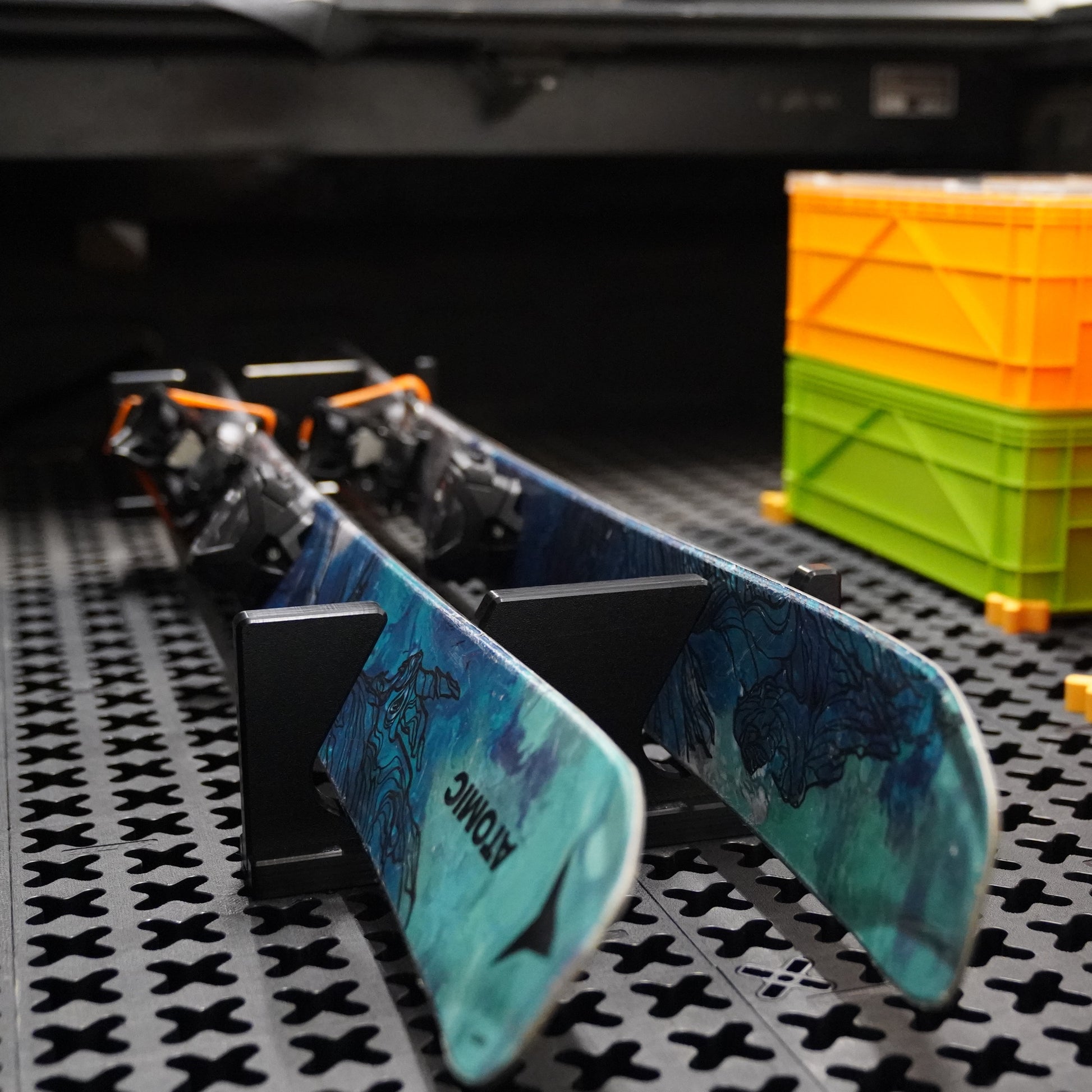 The Tmat Ski Holder is a floor-mounted solution designed to hold ski's. Made in the USA, it can be easily mounted into the Tmat Cargo System using our pre-installed tight-fit anchors to ensure stability and reliability.